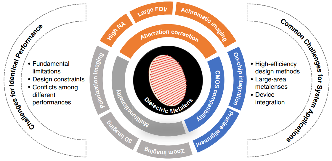 论文还强调了介质超构透镜发展未来集成光学系统应用面临的难题,并结合前沿进展提供了可能的解决方法。文章指出:(1)超构透镜的常规设计方法存在相位离散和制造约束等因素带来的局限性,实现大孔径、大视场、大宽带和高效率的超构透镜仍有难度;(2)随着计算机技术的发展,高性能超构透镜的智能设计已呈快速发展之势,但还应通过进一步优化设计原理实现高性能高效率设计;(3)先进数据处理算法、发展步进式光刻和纳米压印技术有望解决大面积超构透镜的高效率制备生产这一难题;(4)超构透镜-传感器封装模块已初见雏形,但芯片集成的超构透镜制备与封装技术仍需进一步发展。