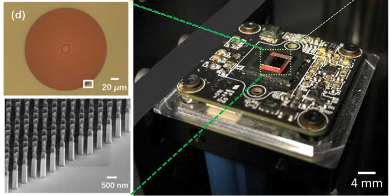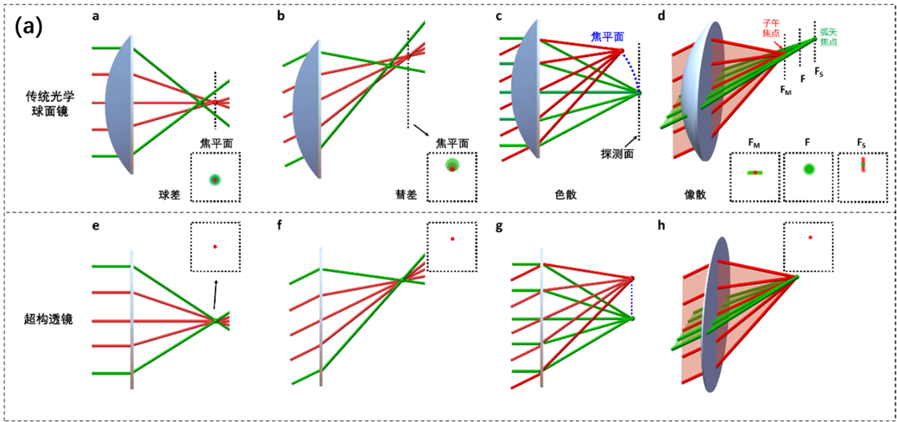 △超构透镜的显著优势。(a)单个传统球面镜的成像存在球差、彗差、场曲、像散等像差;单片超构透镜可实现图例所示消像差成像;(b)消色差超构透镜;(c)基于超构透镜的偏振成像研究示例;(d)超构透镜与CMOS的集成示例