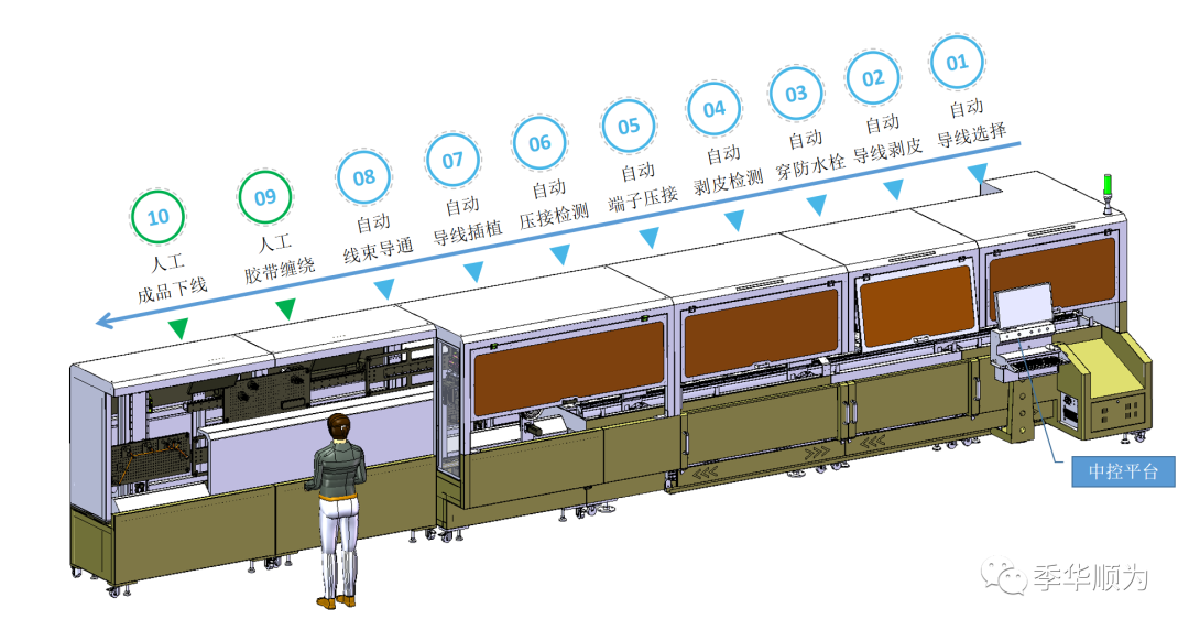 企业代表一行来到季华顺为车间,参观了从量长、裁线、剥皮、预装、压端子、插值、导通检测等全自动生产过程,实现了全工艺流程在生产线上完成,下生产线即可交付客户。是目前市场上第一条真正实现全工艺流程的物流自动输送、品质在线监测、信息实时采集的线束生产线。