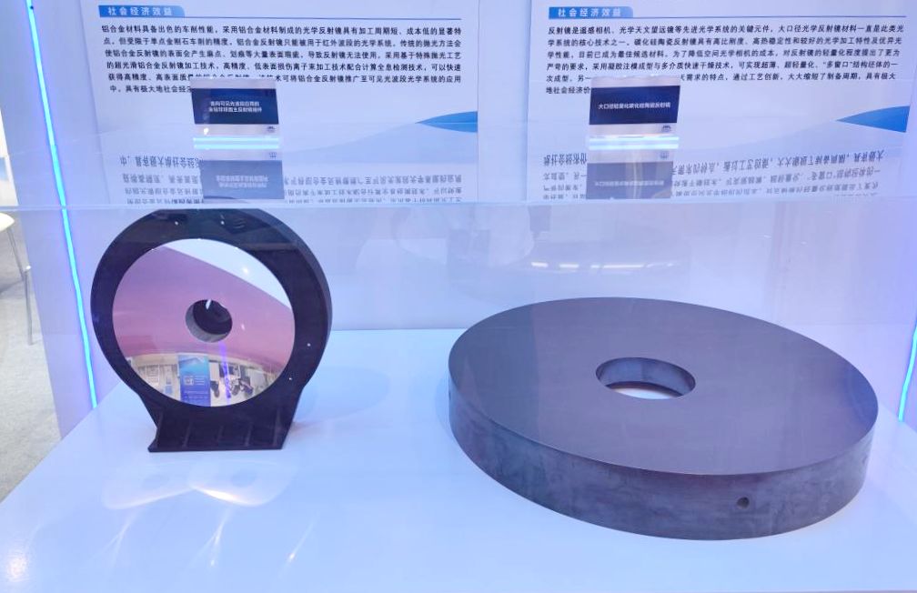 在新材料新器件领域重点展示了“碳化硅陶瓷反射镜”“面向可见光波段应用的全铝非球面主反射镜组件”“光电加工磨削液”“光电行业加工液废液在线过滤净化回用系统”“高低温原位电镜表征互联平台”。其中,“碳化硅陶瓷反射镜”采用以凝胶注模成型和反应烧结为主体的制备工艺路线,实现了大口径轻量化碳化硅陶瓷反射镜坯体材料的制备。“面向可见光波段应用的全铝非球面主反射镜组件”采用全铝轻量化的一体化设计思想,实现了面向可见光应用的全铝反射镜组件的制造。“光电加工磨削液”及“光电行业加工液废液在线过滤净化回用系统”可广泛应用于先进光学与光电子仪器、机器人、新一代半导体器件和集成电路芯片等领域,助力企业在获得极高加工效率的同时,保证零件加工精度和表面完整性,同时实现绿色环保无污染。