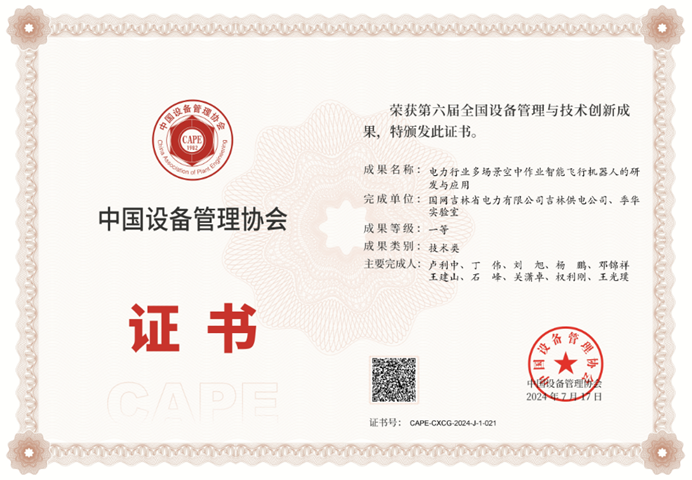 近日,由中国设备管理协会主办的第六届全国设备管理与技术创新成果评选结果揭晓,季华实验室智能机器人研究组与国网吉林省电力有限公司吉林供电公司合作项目“电力行业多场景空中作业智能飞行机器人的研发与应用”,因其在电力运维领域的创新应用荣获技术类一等奖。