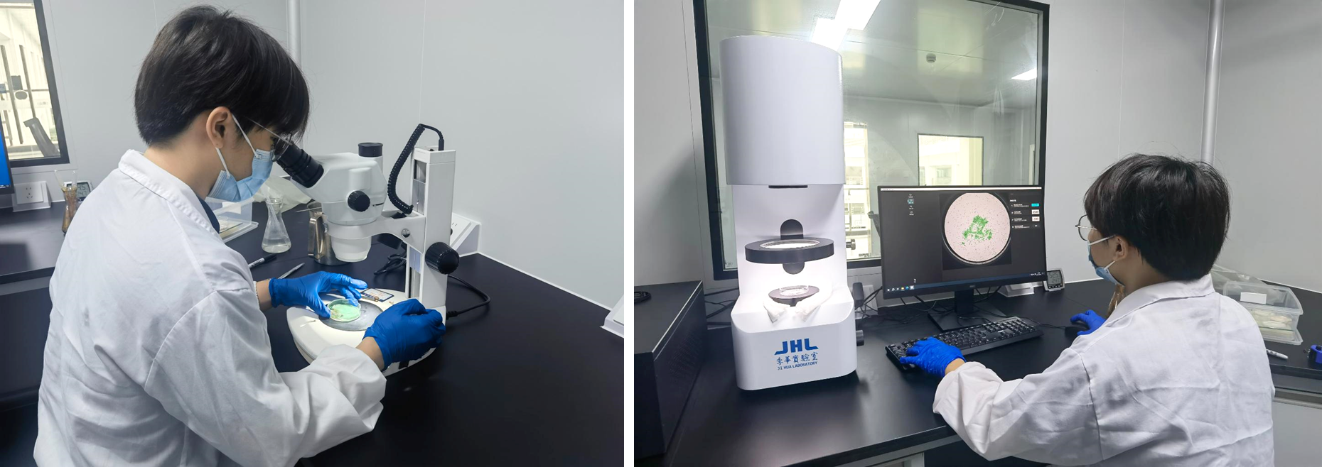 △左:传统检测(高倍率显微镜和人工计数);右:智能检测:(大视场高清成像和智能识别)
