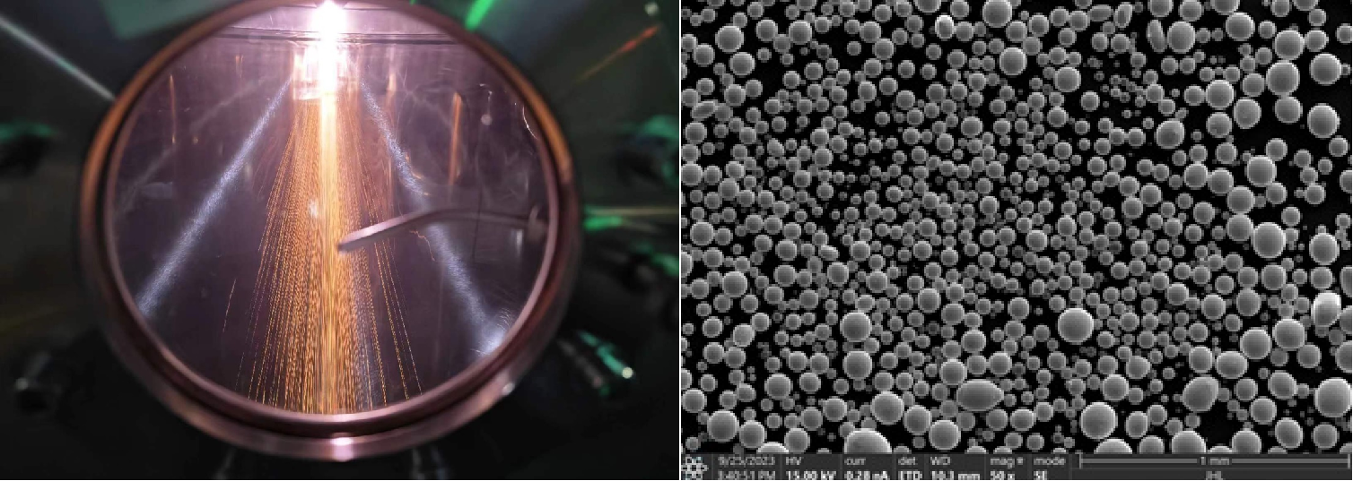 图2 等离子体雾化过程及制备的高品质铂金粉末