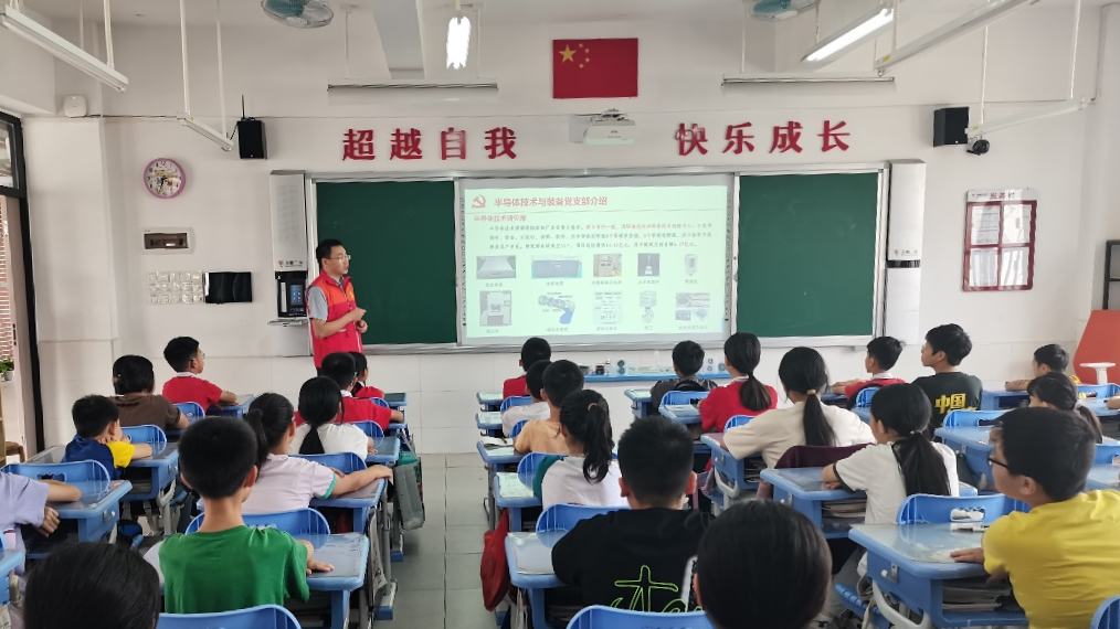 2024年4月18日下午,中共季华实验室半导体技术与装备党支部成员在支部委员戴科峰的精心组织下,赴文翰第二小学开展了科普教学活动,为五年级503班的同学们讲述了从一粒沙到一颗“芯”的故事。党支部书记侯少毅带队,党支部委员及党小组组长参与了本次活动。