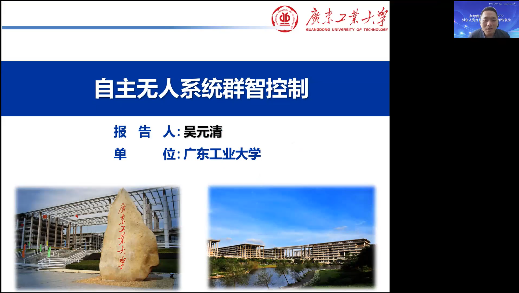 在报告中,吴元清教授基于自主无人系统已成为《中国制造2025》和《新一代人工智能发展规划》中的重点支持研究领域这一背景,为我们展开关于他所在团队关于自主无人系统的最新研究和实验结果。他指出随着自主无人系统的应用环境与任务要求进一步多样化、复杂化与智能化,现有的自主无人系统建模与控制方法已经无法满足日趋复杂多变的任务需求。针对自主无人系统存在的科学问题,吴元清教授所在团队设计了自主无人系统的机械设计、加工制造、电路板设计、集成组装4个流程,并将算法应用于智能无人巡逻车及机械狗。同时,吴元清教授带领学生自主研制了智能无人巡逻车及机械狗的电控系统、通讯系统、定位系统、视觉处理系统、上位机系统和群智控制系统这6个主要系统,实现了智能无人巡逻车及机械狗的电机驱动与控制、信息采集与信息传输、室内外定位、视觉图像获取与处理、远程控制与数据分析、群智协同控制与平台搭建。线上观众就吴元清教授的报告内容提出了室外多智能体之间是如何进行通讯的等问题,得到了吴教授的热情回答。
