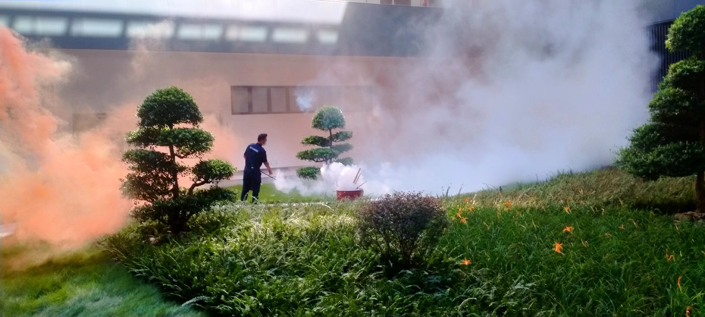 演习开始,代表明火的橙黄色烟雾从一楼滚滚涌出,现场人员立即按下手动火灾报警按钮,消防控制室接到火灾警报后立即让巡逻的安保人员到达现场查看火情,确认火灾发生后立即播放消防应急广播组织职工进行疏散,同时实验室志愿消防队赶到现场进行灭火。在演习过程中,还进行了较大火势情况的相关演练,对呼叫外部支援、消防队到场灭火等具体环节进行了模拟。