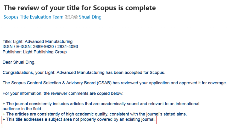 日前,季华实验室主办期刊Light: Advanced Manufacturing(中文名《光:先进制造》,简称LAM)编辑部收到Scopus评审委员会的通知:该刊通过Scopus Content Selection & Advisory Board(CSAB)严格审查,被Scopus数据库正式收录!评审意见中不仅肯定了LAM期刊的出版质量,同时还指出了LAM的期刊定位和主题范围暂未出现在现有期刊当中,进一步认可了该刊在学科领域上填补出版空白的重要作用。