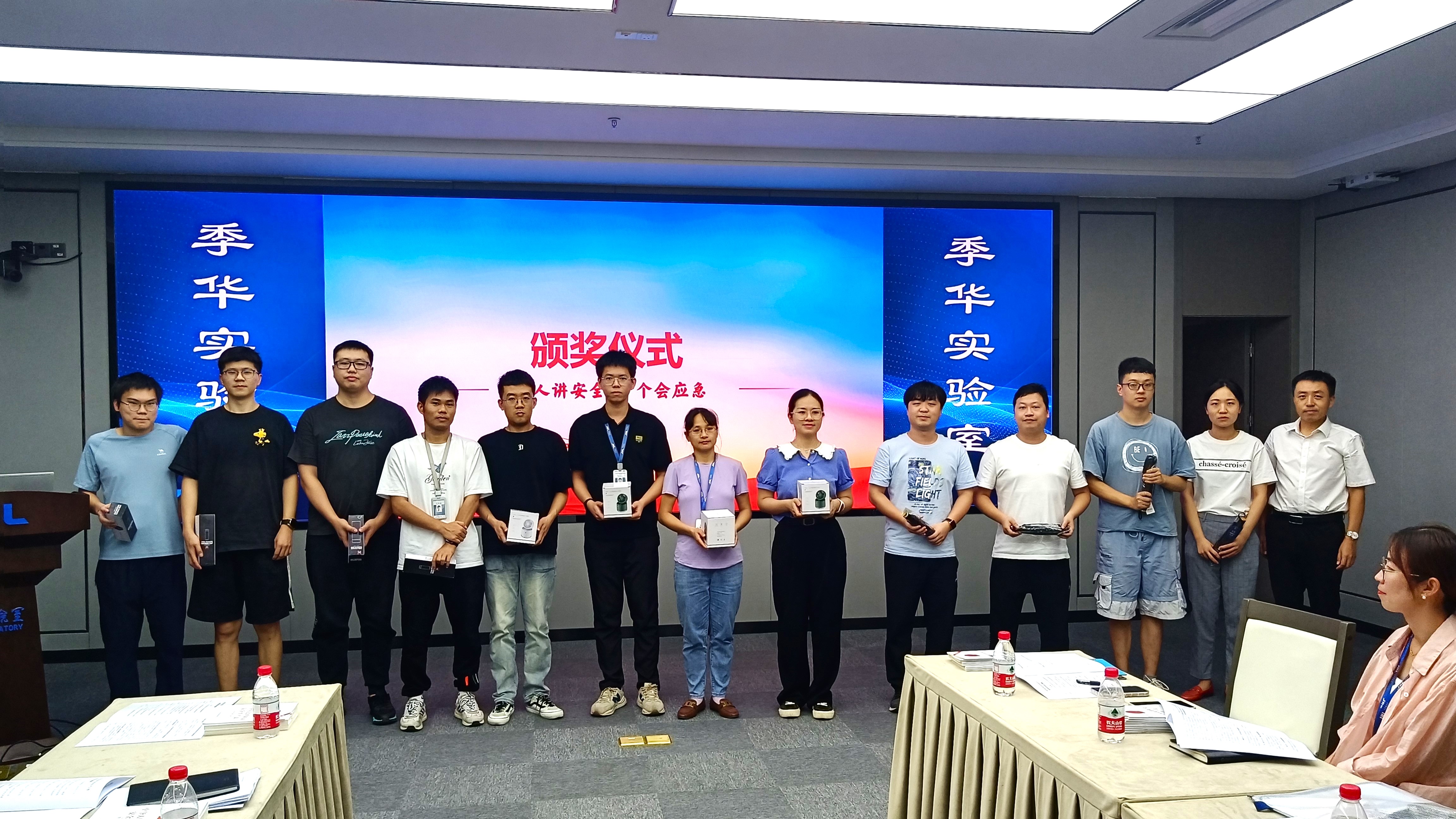 接下来,李悦重点汇报了“安全生产月”各项活动的开展情况。在隐患排查方面,安委办结合日常巡查工作,梳理形成了“常规抽查”“重点排查”“专项排查”三级检查机制。“常规抽查”主要面向集中办公区域、常规科研设施区域、公共区域和园区路面等部位;“重点排查”主要面向发电机房、配电间、危化品库、特种设备和工艺环境较为复杂的科研区域;“专项排查”指在“6.21银川烧烤店爆炸特别重大事故”发生后,安委办对职工食堂进行专项排查。通过上述三级检查机制,将隐患落实到部门,并同步开展隐患整治工作。在应急演练方面,针对发电机房和配电房等重要防范区域,在以往应急演练的基础上,新增了“两中心”(后勤服务中心和运行保障中心)联合应急演练,并对演练进行了复盘,对其中暴露的不足和问题进行了总结并制定了相应的解决方案。在安全知识竞赛方面,共有39个部门/团队的127人参与了竞赛活动,其中26人获得了满分。谢文韬为出席此次活动的获奖代表颁奖。