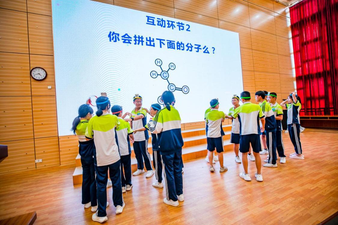 为了让学生们更好地理解分子结构,讲师精心准备了互动游戏,让在场的师生自愿上台进行角色拼凑,用最快的速度拼出来分子,让学生通过形象具体的画面加深记忆。