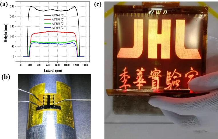 图:印刷高介电绝缘薄膜(a)形貌、(b)柔性器件以及(c)柔性Mini-LED显示样机