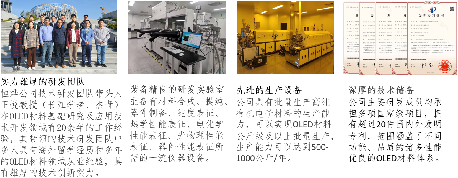 恒烨材料的研发团队经过多年的技术创新与积累,开发了涵盖注入层材料、传输层材料、阻挡层材料、发光主体材料、发光掺杂材料的一系列具有自主知识产权的高性能OLED材料体系,其中一些材料的性能已经达到或超过了商用标准,目前处于商业化推广阶段。