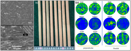 图1. (A)铸态组织图;(B)轧态组织图;(C)传统条件下轧制的轧棒;(D)轧制后组织极图。
