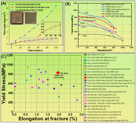 与国际上公开报道的TiAl合金相比,该新型TiAl合金不仅展现出良好的热加工性能,而且拥有优异的抗氧化性能以及出色的综合力学性能。等温热压缩实验证明,该合金在1200℃及以上的温度下最高变形速率可达1 s-1(图2)。在850℃/1小时循环氧化100周次的氧化实验中,该合金的氧化增重仅为0.9 mg/cm2,平均氧化速率仅为0.089 g·m-2·h-1,达到完全抗氧化级别(按照HB 5258-2000标准执行)(图3(A))。该合金在室温下的屈服强度可达834 MPa,断裂延伸率为2.0 %;而在服役温度850 ℃下,屈服强度仍可达525 MPa,且在750~850℃服役温度范围,屈服强度的降低并不明显(图3(B)(C))。