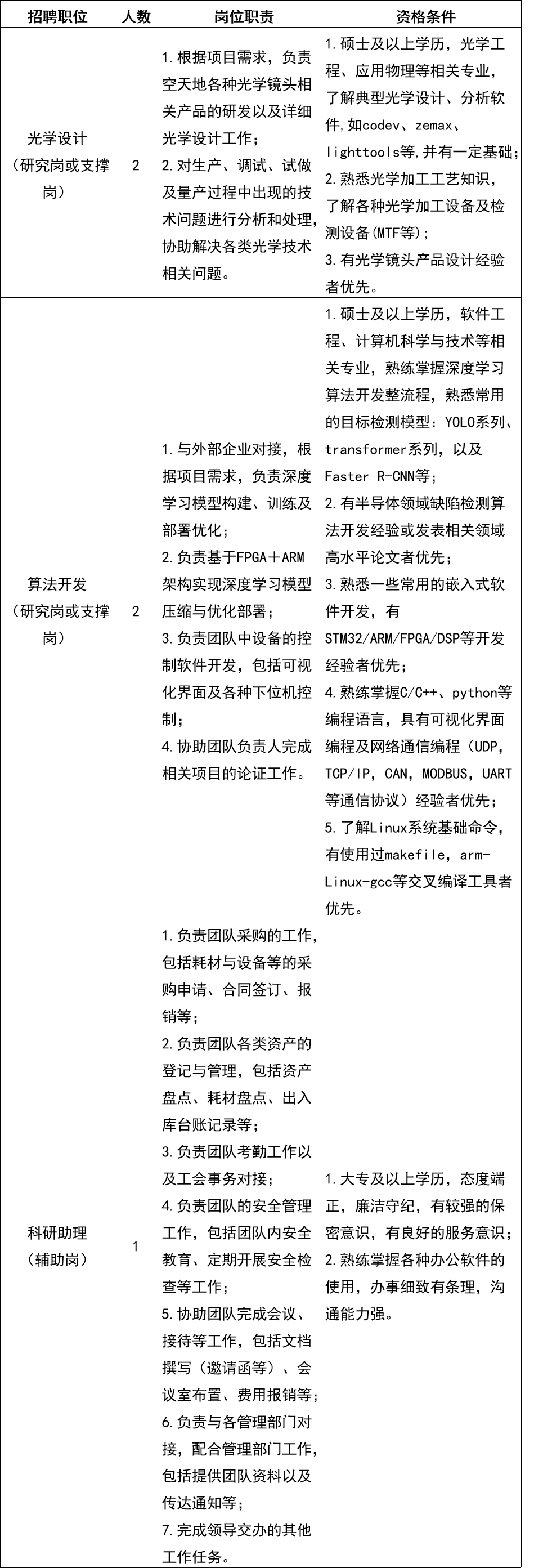 现根据工作需要,实验室光电科学与技术研究部先进光电智能装备研究组拟招聘如下劳动合同制岗位: